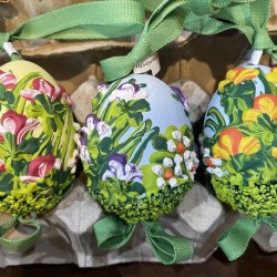 Handpainted, real eggshell decoration imported from Austria. Each eggshell is threaded with a ribbon for easy hanging, or leave the ribbon bow tied to display the eggs in a bowl.